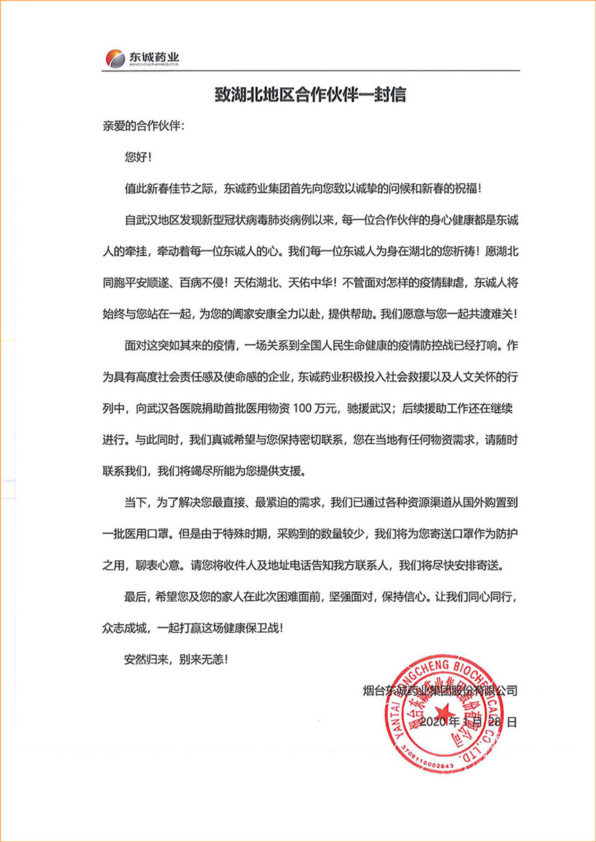 When facing this sudden outbreak, a war of pneumonia prevention and control related to the lives and health of the people has begun. As an enterprise with a high sense of social responsibility and mission, Dongcheng Pharmaceutical has been actively involved in social relief and humanistic care, donating the first batch of medical supplies of 1 million yuan to hospitals in Wuhan for help. Follow-up assistance is continuing. At the same time, we sincerely hope to keep close contact with you. If you have any material needs in the local, please feel free to contact us. We will do our best to provide you with support.