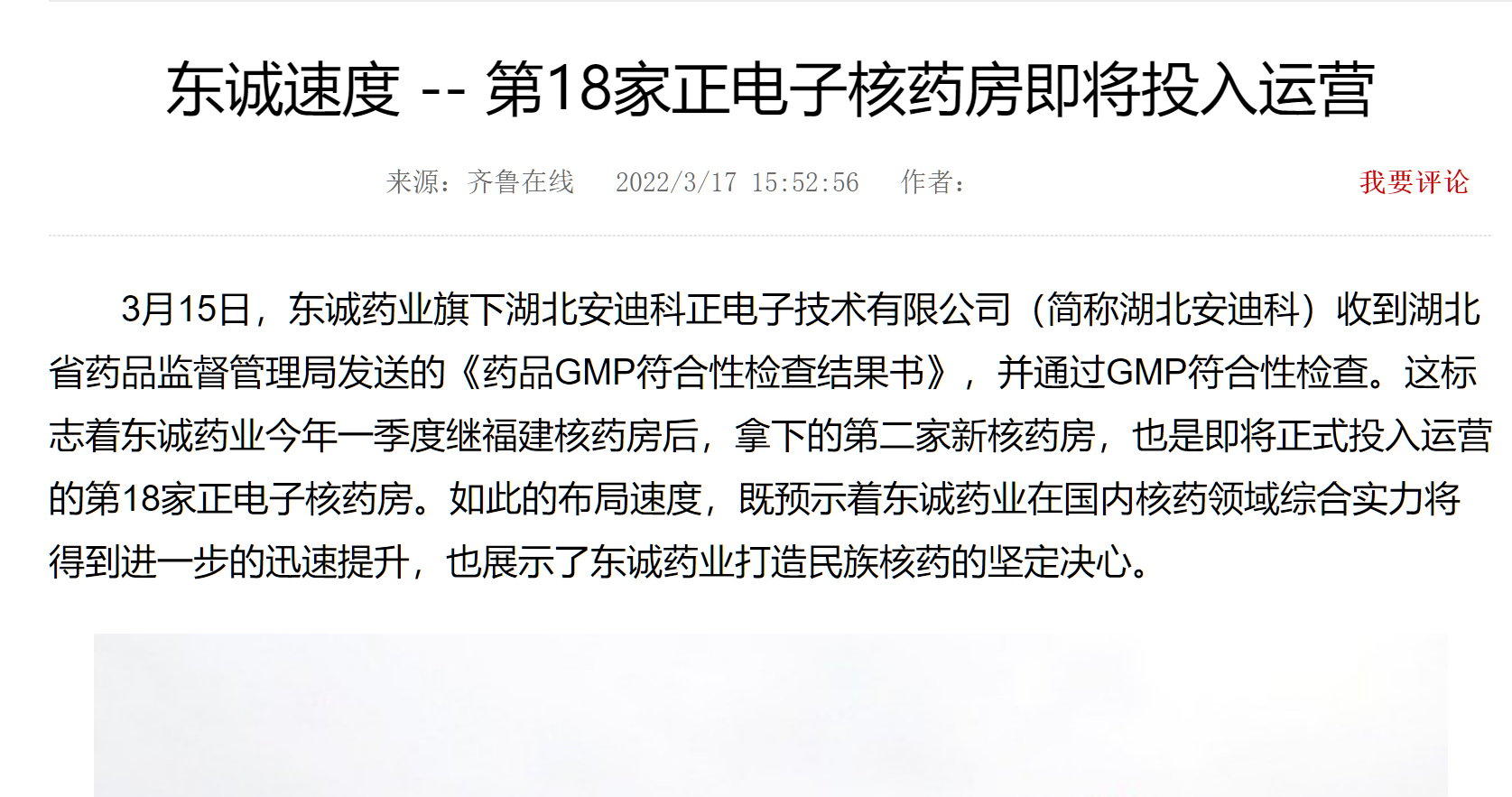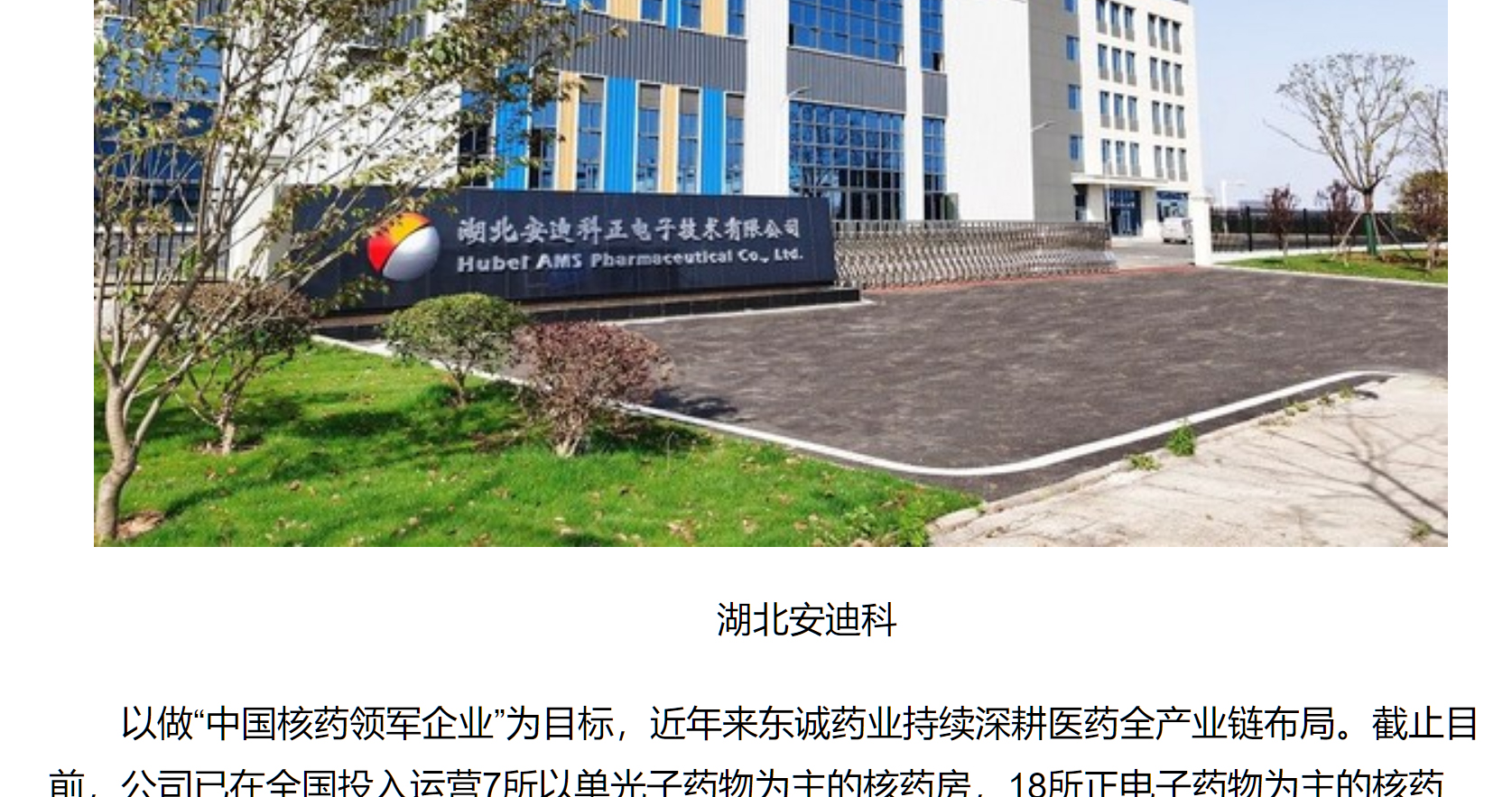 3月15日,東誠藥業(yè)旗下湖北安迪科正電子技術(shù)有限公司(簡稱湖北安迪科)收到湖...