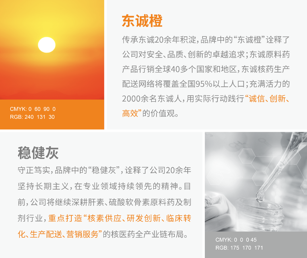 行業(yè)的發(fā)展,東誠原有業(yè)務(wù)延伸及核藥新業(yè)務(wù)的快速成長,原有品牌形象已經(jīng)不能完全支撐當下及公司未來發(fā)展規(guī)劃。本次形象升級在傳承的基礎(chǔ)上進行了簡潔化、國際化的設(shè)計,表達了東誠在持續(xù)夯實化學藥業(yè)務(wù)基礎(chǔ)上,著力重點發(fā)展核醫(yī)療產(chǎn)業(yè)。